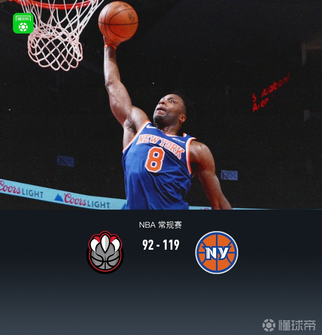 第四节猛龙马穆凯拉什维利拿下7分,尼克斯约什-哈特拿下11分,最终猛龙92-119不敌尼克斯